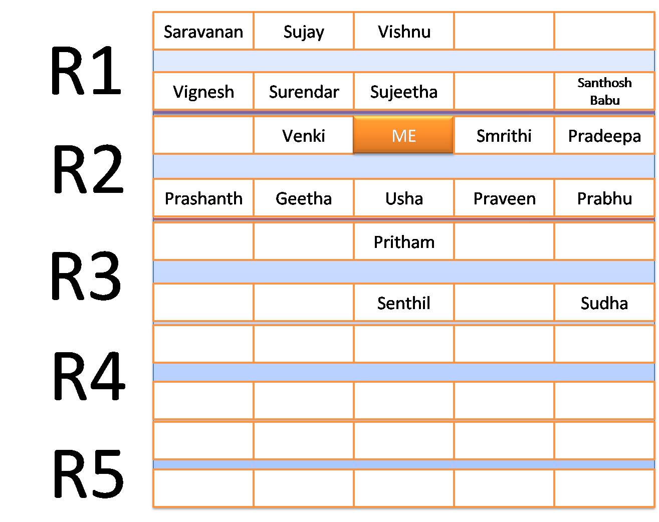 Apparam senthiloda turn vanthuthu .. Geetha maam :-) . Sema kaththu .. Enna aachinnu appo theriyala … Meanwhile B sir enga rowla rendu perukku than paathu irunthaar .. Prashant , Geetha … Innoru pakkam prabhu sirR1 la ellarukkum mudichittaru .. Saravananum Sujayyum than baakki … So appo oru calc pannen … Prabhu sir oda current positionla irunthu 5 aavathu aal naan , B sir kkum athe 5 thaan … Geetha maam apppo R4 mudichittu R3 mukkavasi mudichittanga …